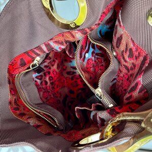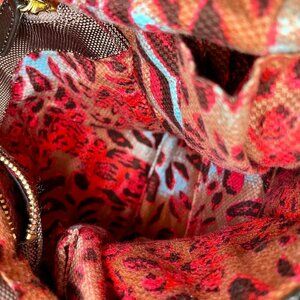 This stylish and functional JPK Paris nylon bucket bag in a rich chocolate brown. The durable nylon exterior is complemented by a wide, comfortable leather shoulder strap with stunning gold-tone hardware. The bag features a snap closure, two zip pockets with leather pulls, and two interior slip pockets for easy organization. The interior showcases a vibrant multi-colored animal print fabric that adds a playful and luxurious touch. Signature JPK Paris hardware completes this sleek and feminine design.