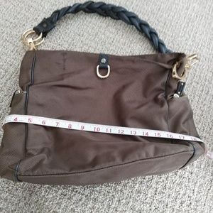 Chocolate Brown canvas. Impeccably clean cotton inside, beautiful gold hardware, immaculate braided leather. "16 across x 11.5 deep.EUC