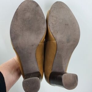 J.Peterman Portuguese Inca leather open toe booties, tan with dark wood heel, leather upper, good used condition some small scuffs but overall very wearable and nice, size 8