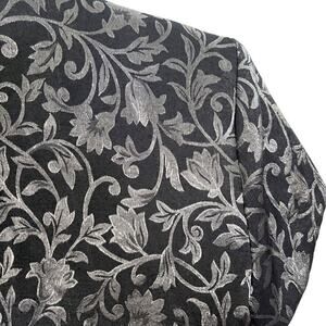 This JR Nites bolero jacket is a stunning piece in silver with a whimsical gothic floral pattern, perfect for parties or formal occasions. The short sleeve and short length design make it ideal for layering over dresses or tops. Made from polyester with a rayon fabric type, it features an open front style and is lined with acetate for a luxurious feel. This size 12 jacket from the United States is a versatile addition to any wardrobe, suitable for summer, fall, and spring seasons.