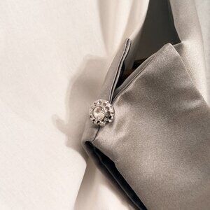 Elegant and timeless J.R. Nites Petites two-piece formal suit set in a beautiful silver satin finish. Perfect for weddings, mother-of-the-bride/groom, formal events, galas, and evening wear. Includes a structured jacket with sparkling rhinestone buttons and a matching long skirt.