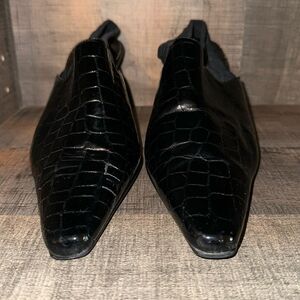 Excellent use condition pair of J.Renee women shoes. Has pointed, square toe with thick elastic band to go around the ankle has 3 inch small heel. Beautiful, black patent leather.