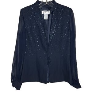 J. R. Nites by Caliendo blue/black beaded blazer. Decretive beading detail Front, Sheer long sleeves, button Front Size M