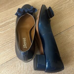 Experience elegance with J.Renee's blue flats, featuring a charming bow detail and a classic rounded toe. These versatile shoes are crafted from a smooth material, offering a timeless style perfect for any occasion.