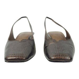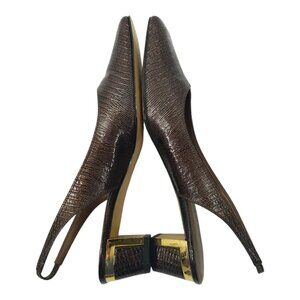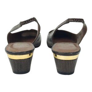 Elegant brown slingback heels. Textured design. Gold accent on heel.