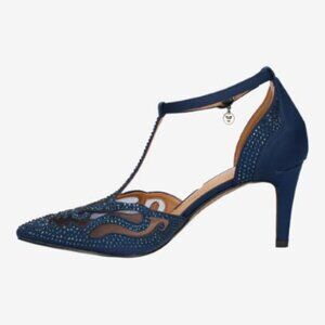 Chic navy heels with elegant embellishments. Perfect for adding flair to any outfit.