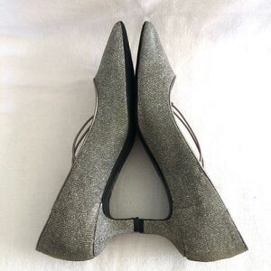 Pewter glitter fabric, memory foam footbed, slender elastic straps. In great condition