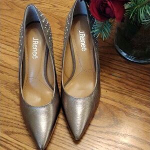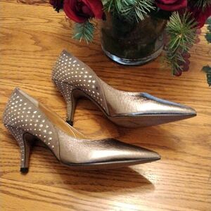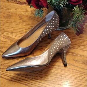 NWOT. Beautiful heels in metallic silver and gray leather. Pointy toes. The back and heels are decorated with sparkly studs. Tiny scuffs on tippy toes (pictured) from careless storage, you won't notice. Padded footbed. 3 inch heels. Size 7. Beautiful and NEW.