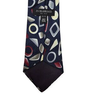 This stunning JS Blank & Co men's silk tie features a bold geometric print in shades of navy, red, silver, and cream. Made from luxurious all-silk fabric, this tie boasts intricate detailing and a soft, smooth texture for a premium wear experience. The geometric design offers a sophisticated yet contemporary edge, ideal for formal events, meetings, or any occasion where a polished look is desired. The tie's vibrant colors add versatility, making it compatible with a wide range of shirts and suits. With quality craftsmanship evident in its sturdy construction and precise finish, this tie is durable and stylish for repeat use.