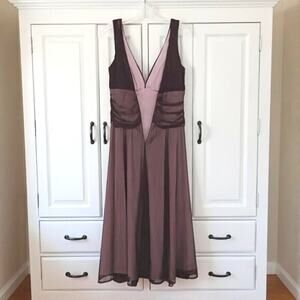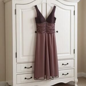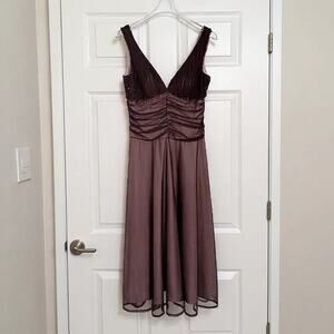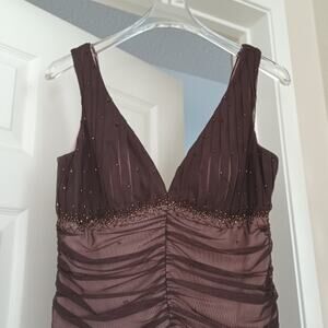 Features: Chocolate mesh overlay, dusty pink lining, deep V-neck, beaded embellishments