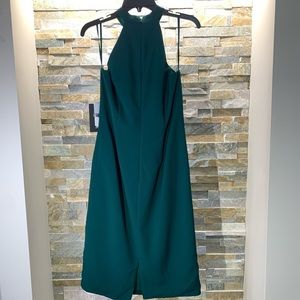 Rhinestones, sequins, and beads dazzle the bust of this sleeveless mock neck dress.