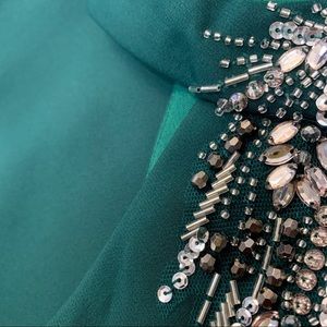 - Rhinestone, bead, and sequin embellishment on bust