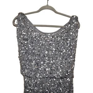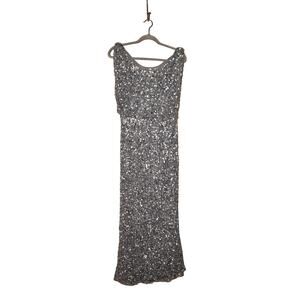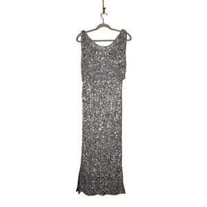 Dazzle in this stunning JS COLLECTIONS evening gown, perfect for your next special event. This elegant sleeveless dress features a boatneck design and is adorned with all-over silver sequins on a mesh overlay. Fully lined for comfort, it boasts a high slit on the left side for added allure. Ideal for formal occasions, this size 4 gown will make you shine and stand out in any crowd.