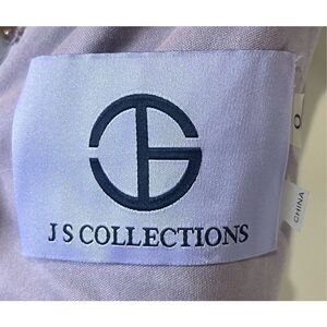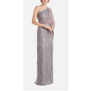JS COLLECTIONS One Shoulder Embroidered Mesh Overlay Asymmetrical Gown in Steel