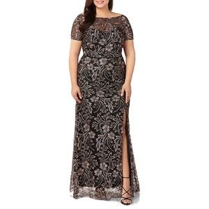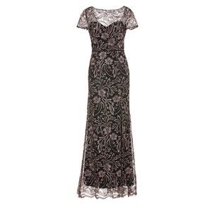 NEW JS COLLECTIONS Salmon Pink Black Embroidered Lace Trumpet Gown Size: 10 (US) Color: Black/Salmon Embroidered flowers illuminate an event-ready gown designed with elegant princess pleats, bateau neckline and sheer short sleeves. Back zip closure. Bateau neck.