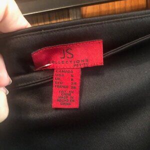 This JS Collections A-Line skirt in black is a must-have for any wardrobe. It's perfect for a night out or a day at the office. The knee-length skirt is made for women in size 6P and has a solid pattern with formal stripes on bottom, that is both elegant and versatile. The skirt is crafted from high-quality with a shein materials and is designed to be both comfortable and durable. With its A-Line style, it's flattering and can be paired with almost anything in your closet. Side Zip. Add this skirt to your collection today and elevate your style game!