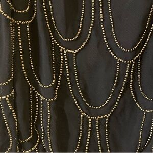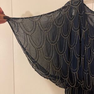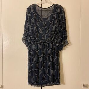 Beautiful deep blue dress with silver beading design in a scalloped pattern. Fully lined. 34”long. 100% polyester. In excellent condition.