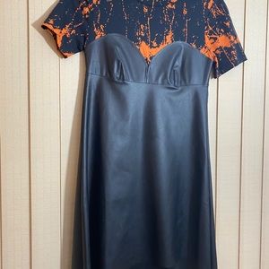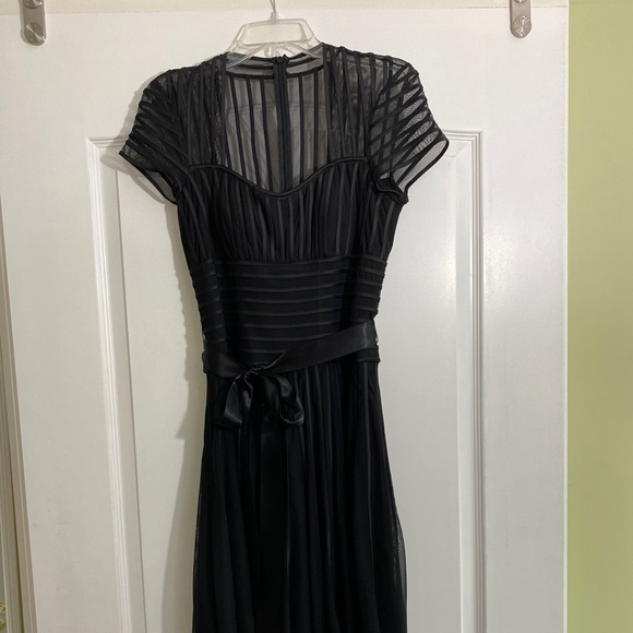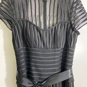 This gorgeous women’s black sheer fitted dress with a sweet heart bust line ,build in bra, sheer piping, throughout the skirt hits just above the knee. Worn once