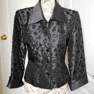 Fitted black jacket/blouse imprinted with vines and leaf pattern embellished in black cylindrical bugle beads.
