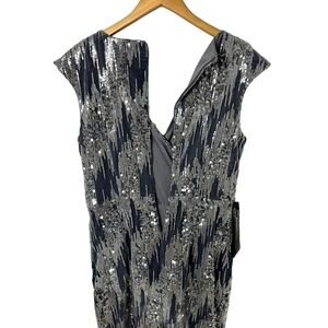 Features: 95% polyester 5% spandex, lined, back zip closure, cap sleeve, v neck, midi length, slightly stretchy, faux wrap, draped silhouette, sequin over a gray blue velvet, gala, cocktail dress, formal, holiday, Wedding guest dress