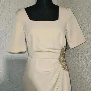 beaded strech crepe, elbow sleeve, square neck, draped ,column gown.