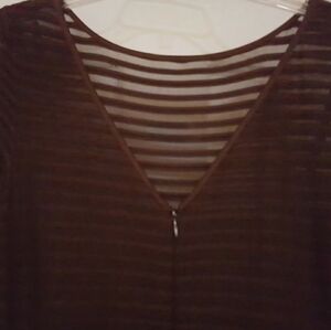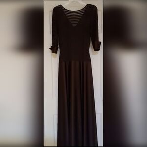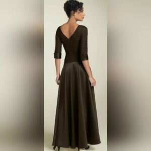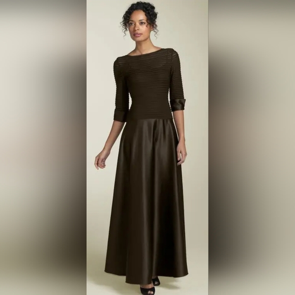 Rich brown color~Lined stretch knit bodice boasts a bateau neckline that falls to a V in back, while sheer, three-quarter-length sleeves end with satin turn-back cuffs.