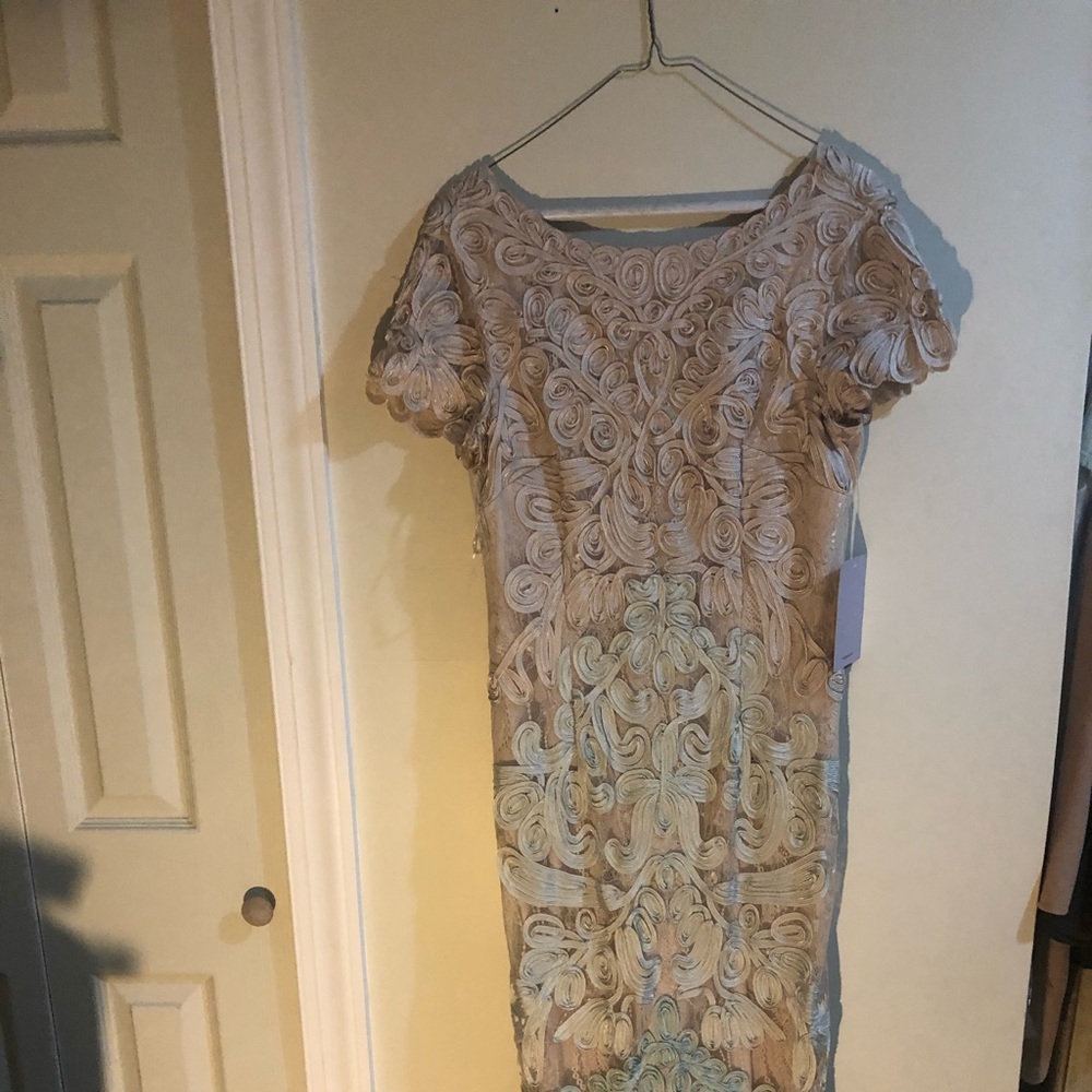 Beautiful never worn dress by JS Collections with beautiful details and an almost blue ombré at the end. It has a zip up back with a V shape just to show a hint of skin. Tags still on!! Could be a prom dress!