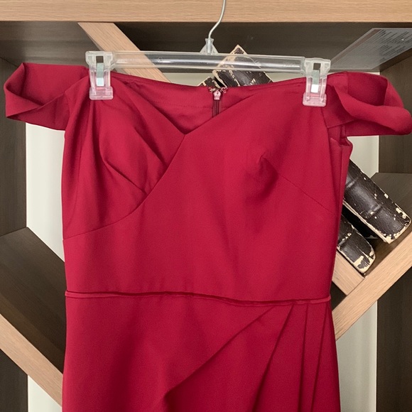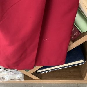 Worn once. Has that small stain at the very bottom (never tried to take it off, don’t think it should be hard to) More towards burgundy rather than red.