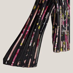 JS Collections Black Colorful Floral Striped Mesh Zip-Up Jacket. This elegant, sheer jacket features a mandarin collar, full zipper front, and long flared sleeves. The body has a textured, pleated or ribbed effect with alternating black mesh and colorful satin-like floral and striped panels.
