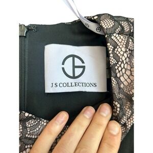 Enchanting elegance defines this JS Collections maxi gown, a captivating blend of modern sophistication and timeless charm. The dress features a sleek black bodice contrasted by a panel of delicate pink pleats that cascade down the front, creating a flattering and graceful silhouette. Ornate beige lace detailing graces the neckline and upper back, adding a touch of intricate femininity. Its floor-length design and subtle flare make it perfect for black-tie events, galas, or any formal occasion where making a memorable statement is essential. The elegant color palette and striking design also make it suitable for a sophisticated wedding guest or a stylish debutante ball.
