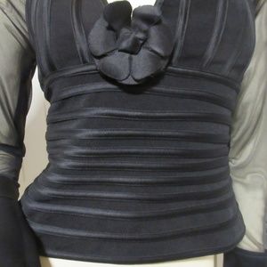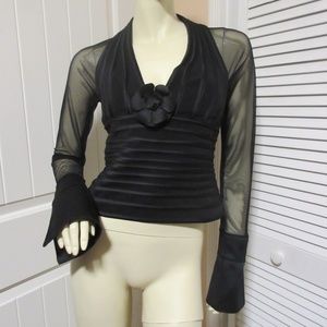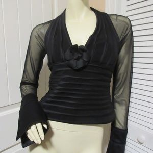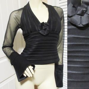 JS Collections womens black evening top blouse - dressy top, cocktail party top, . Fit-and-flare sheer mesh long sleeve with solid trumpet/flare cuffs. Sheer mesh upper back. Plunging neckline or deep V-neck with decorative 3D floral/flower embellishment at bust. Fitted bodice and structured ribbed waist paneling. Excellent LIKE NEW condition. Material is 97% Polyester 3% Spandex, COMBO 80% Polyester 20% Spandex, COMBO 100% Polyester. MADE in CANADA.
