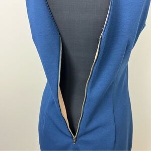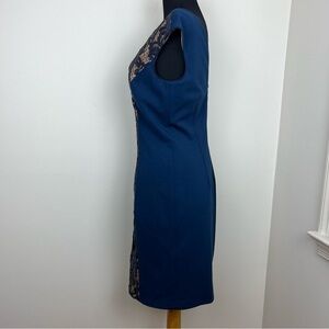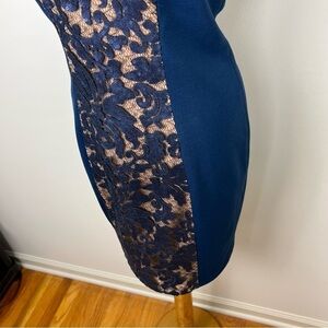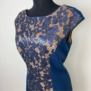 JS Collections Blue Tan Lace Overlay Sheath Dress