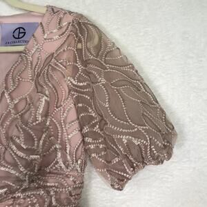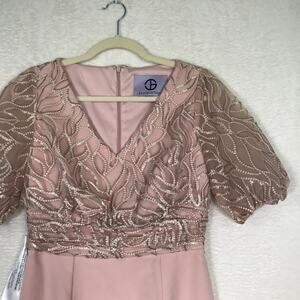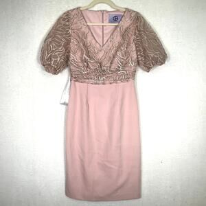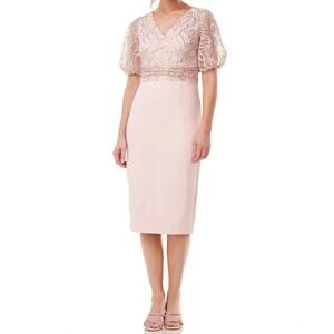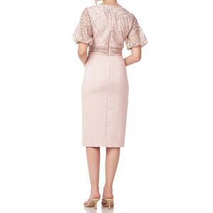 JS Collections Dress Womens 2 Pink Embroidered Sequin Beaded Puff Short Half Sleeve Knit Emersyn Midi Knee Slit Formal Party Cocktail Wedding Sheath English Rose V Neck Mother of the Bride Groom Floral