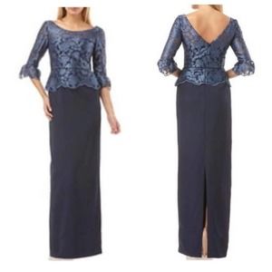 Lustrous floral embroidery embellishes the romantic peplum bodice of a floor-skimming gown with a contrast pencil skirt.