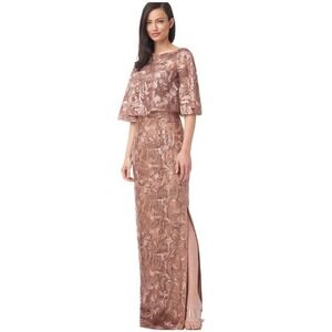 Twinkling sequins trace sweeping filigree leaves on this elegant gown that features a fluttery overlay top and a split down the side. Boat neck. Elbow-length sleeves. Lined. 100% polyester. Dry clean. Imported.