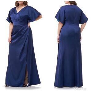 Pleat detailed gown. Elegant dolman sleeve. Alluring side slit. Hidden back zip closure. Surplice V neck. Lined. Runs large.