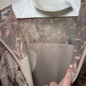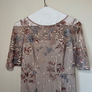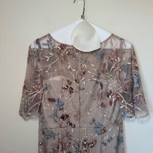 Elegant maxi dress with floral embroidery. Features short sleeves and a sheer overlay. Perfect for special occasions.