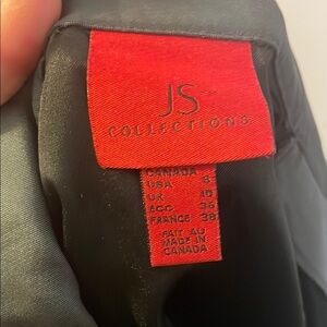 JS Collections Gray Satin Rhinestone Button Blazer Jacket or Blouse size 8. Very good preowned condition. See pictures for approximate measurements. Elevate your style with this JS Collections blazer or blouse, crafted in a luxurious gray/dark silver acetate fabric. The tailored design features a notched lapel collar and you can add a matching belt to enhance your silhouette. Does not come with a belt. Perfect for adding a touch of elegance to any ensemble. Cuffed sleeve with points. Possibly vintage.