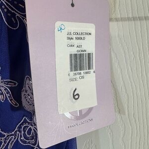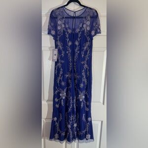 This elegant blue midi gown by JS Collections is adorned with intricate floral embroidery, perfect for a wedding guest or cocktail event. The dress features a crew neck and flutter sleeves, adding a touch of romance to its flowing silhouette. Its sheer overlay and delicate design make it a standout piece for any special occasion.