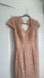 Elegant blush lace maxi dress. Perfect for formal events. Features cap sleeves and a fitted silhouette.