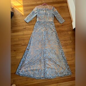 Chic long sleeve dress with intricate lace design. Light blue hue adds elegance. Ideal for formal events.