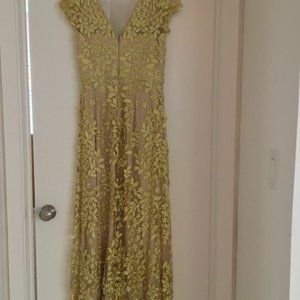 Perfect for your next special event, this illusion-yoke midi dress features a sheath silhouette and all-over floral lace. Yellow/gold lace over nude sheath. Scooped front, V- Back. Size 8. Altered - shortened to 40” from the waist, great for someone 5'4" and under. Worn once for a wedding, dry cleaned. Perfect condition.