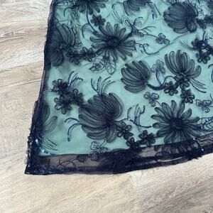 Details: Delicate navy mesh top layer with intricate black floral appliqué and scattered beadwork. Light blue lining adds dimension and contrast. Invisible back zip.