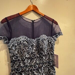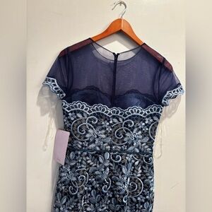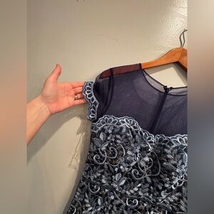 Stunning navy dress with intricate embroidery. Short sleeves and elegant design. Ideal for formal events.