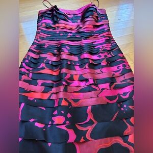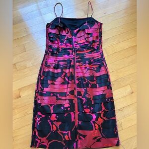 Elegant dress with pink and black stripes. Features a fitted silhouette and spaghetti straps. Perfect for evening events.
