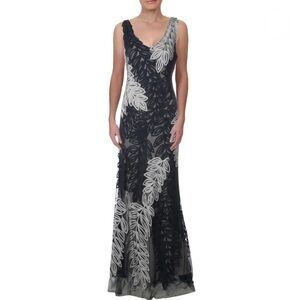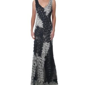 JS Collections Soutache Embroidered Leaf Gown in Navy/Cloud