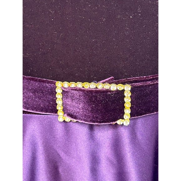 0913A- JS Collections Women’s Purple gown 8 Vintage, Fit & Flare made in Canada, 90% polyester, 10% spandex, dry, clean, only, see-through shoulders, short sleeve, round neck, velvet top, with matching velvet belt, 1.25.” Wide, with rectangular round rhinestones buckle loop. Polyester from the waist down. Looks like satin. Has a beautiful sheen.