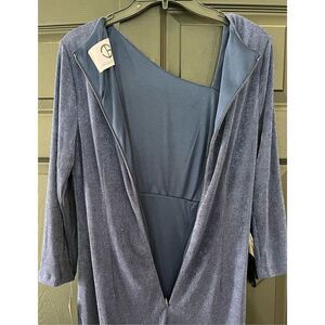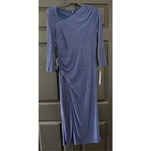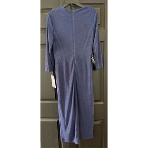 Tonal glitter stripe tea length slim stretch knit dress with 3/4 sleeves, asymmetrical neckline and angled draped gathers and a curved princess seam with front slit.