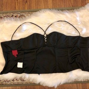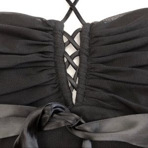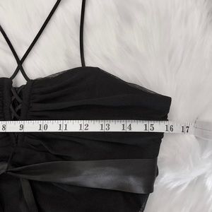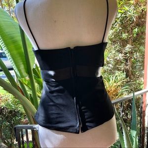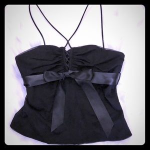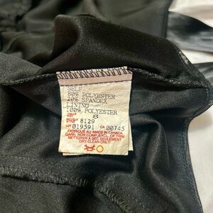 Excellent preloved condition black elegant top . Made in Canada, label size US8, my estimated measurement chest area 16” laying flat . Zipped all the way up back, satin ribbon under bust line, cut length to waist.