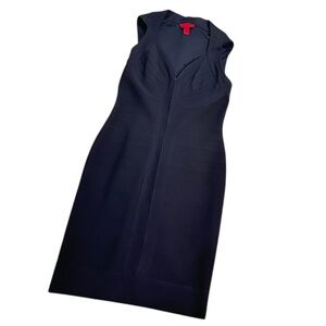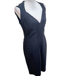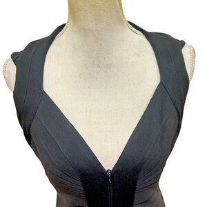 JS Collections black bodycon bandage midi dress with a sleeveless design. Features a flattering V-neckline. Lined. Front zip up. Perfect for elegant occasions. Wore once. Like new.
